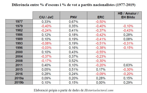 Com es pot observar, el màxim "sobrepès" d'aquests partits es troba en el resultat obtingut pel PNB el 1977, quan amb un 1,62% de vot popular va aconseguir un 2,29% dels escons del Congrés (8). Si ens fixem en les darreres eleccions, podem veure com JxC va aconseguir un 2,29% dels escons (8) amb un 2,19% dels vots, el PNB va assolir un 1,71% dels escons (6) amb un 1,56% dels vots, ERC un 3,71% dels escons (13) amb un 3,71% dels vots (un percentatge exactament igual!), mentre que EH Bildu va aconseguir un 1,43% dels vots escons (5) amb un 1,14% dels vots. Aquestes són les dades que, com es pot apreciar, deixen un missatge força clar: la representativitat (en escons) d'aquests partits nacionalistes no es pot afirmar que estigui molt per sobre del que hauria de ser una proporcionalitat perfecta. En molts casos fins i tot és inferior, com es pot observar al quadre anterior.