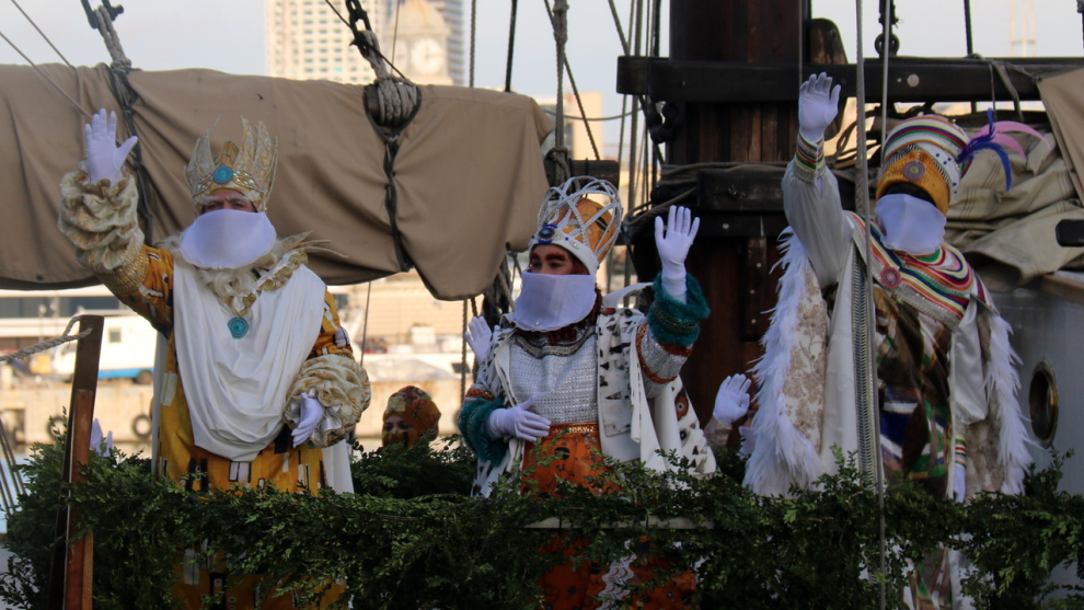 Els tres Reis d'Orient saludant des del pailebot Santa Eulàlia, al Port de Barcelona. Pilar Tomás / ACN