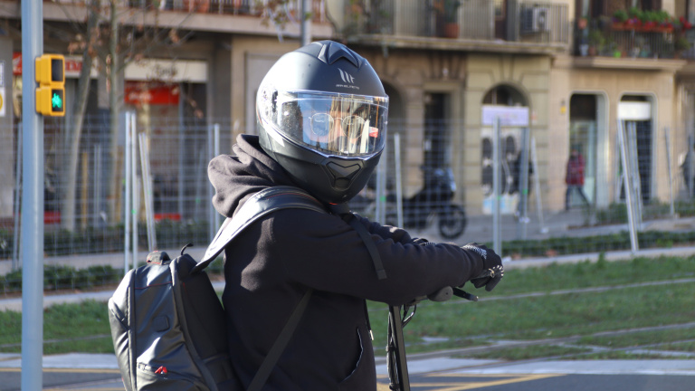 Una persona amb casc circulant per Barcelona amb un patinet