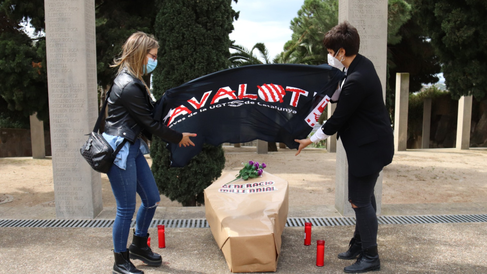 Només el 10% dels menors de 30 anys sense feina tenen dret a una prestació d'atur, segons ha denunciat la secció juvenil de la UGT, Avalot, aquest dijous en una acció reivindicativa al Cementiri de Montjuïc on han escenificat "l'enterrament del jovent de la classe treballadora" que ha quedat "devastat" per la Covid. El sindicat ha elaborat l'informe "Generació enterrada" per exemplificar que la crisi s'ha acarnissat amb els joves que no només tenen una taxa d'atur que duplica la general sinó que es queden sense cap protecció quan perden la feina perquè molts treballaven amb un contracte amb pràctiques o en negre i no tenen dret a una prestació. També pateixen una temporalitat molt més elevada que el conjunt de la població i tenen sous més baixos.