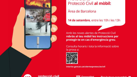 El pròxim dijous, 14 de setembre, tots els telèfons mòbils intel·ligents amb cobertura a la demarcació de Barcelona rebran un missatge de prova del sistema d’alertes de Protecció Civil de la Generalitat. L’assaig tindrà lloc entre les 10 del matí i les 13 h a les comarques del Barcelonès, Vallès Occidental, Vallès Oriental, Maresme i Baix Llobregat, i serà el de major abast de població que s’ha fet fins ara a Catalunya.