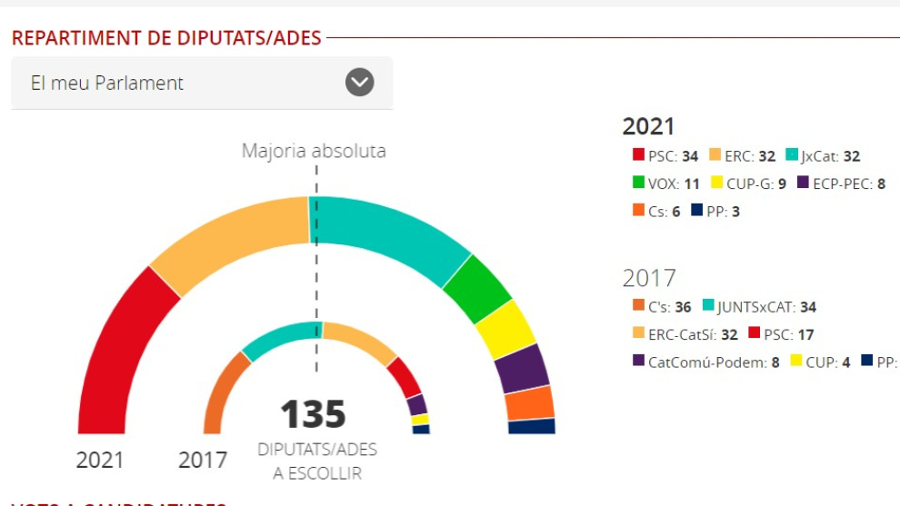 Si l'escrutini continua com fins ara, les eleccions al Parlament deixaran un escenari similar a les del 2017, amb tres partits força igualats i per sobre dels 30 diputats i amb un guanyador en vots i escons que ho tindrà molt difícil per poder governar. Amb un terç del vot escrutat el PSC s'imposa amb 34 diputats i el 24,6% dels vots, mentre que Esquerra empataria a 32 escons amb JxCat, tot i superar-lo en vots (21,3% contra 18,8%). Això significa que ERC i Junts sumarien 64 escons, dos menys que el 66 actuals, però l'independentisme s'enfila fins als 73 -ara en té 70- gràcies al creixement de la CUP, que passa a de 4 a 9, mentre que el PDeCAT no entraria.