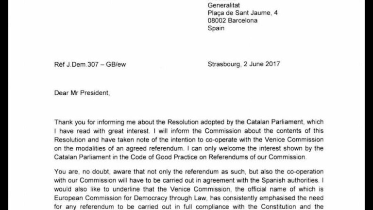 El president de la Comissió, Gianni Buquicchio, en una carta de resposta enviada divendres i que s'ha conegut aquest dissabte recorda que tant el referèndum com qualsevol participació d'aquest organisme en la seva celebració s'ha de fer "d'acord amb les autoritats espanyoles". El president de la Generalitat, Carles Puigdemont, ho ha interpretat com un emplaçament al Govern espanyol perquè negociï.