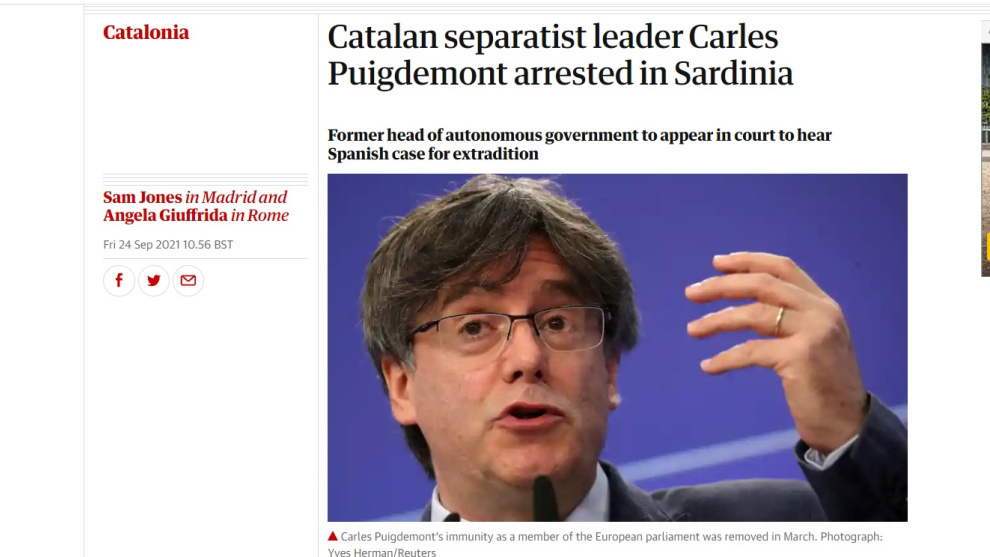 La peça que el britànic 'Guardian' ha dedicat a la detenció de Puigdemont.