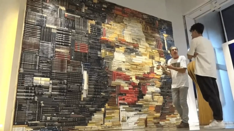 L'artista anomena aquesta tècnica concreta 'mosaic de llibres', i aconsegueix fer que els volums, ordenats de forma determinada, recreïn imatges o retrats artístics. Això sí, si ens acostem, veurem com de prop s'assemblen més a una llibreria desordenada, cal prendre distància.