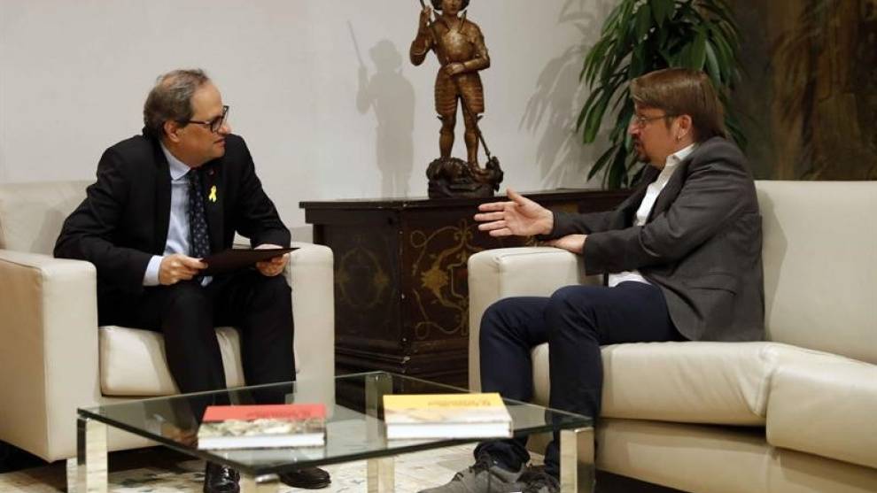 El líder dels Comuns proposa al president de la Generalitat la creació d'una "taula de diàleg", "per arribar a grans consensos de país". En matèria legislativa manifesten acord sobre la necessitat de recuperar les lleis suspeses pel Tribunal Constitucional, però Domènech exigeix l'aplicació de tot el que no ha estat invalidat. La CUP s'allunya de les posicions del Govern, que considera autonomistes, i anuncia que és quasi "impensable" que avalin els pressupostos de Torra.