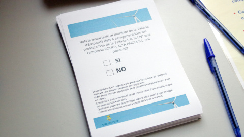 Els veïns de la Tallada d'Empordà han votat aquest dissabte en una consulta popular sobre el projecte d'instal·lar quatre aerogeneradors de 200 metres al municipi. Hi han participat 324 persones de les 487 cridades a les urnes, i el resultat ha estat molt contundent: 310 vots (95,6%) en contra i 11 (4,4%) a favor. També s'han registrat tres vots nuls. Podien votar-hi les persones majors de 16 anys empadronades al municipi o que hi tinguessin una segona residència.