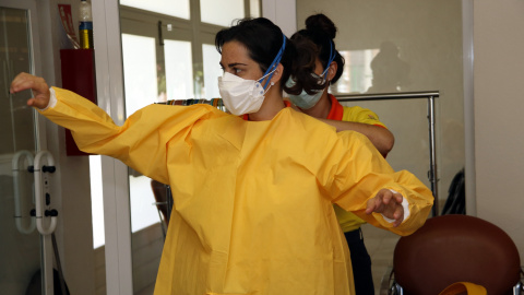 Dues sanitàries equipant-se amb EPI's per fer proves PCR a Albesa. ORIOL BOSCH / ACN