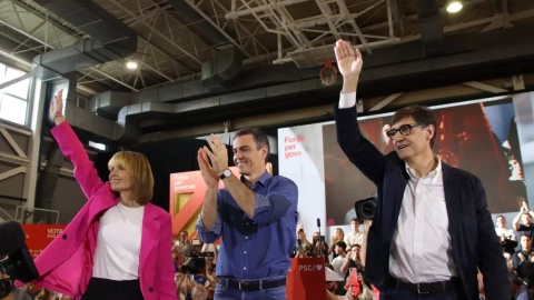 Lluïsa Moret, Pedro Sánchez i Salvador Illa en l'acte d'aquest dijous del PSC a Sant Boi de Llobregat. Mariona Puig / ACN