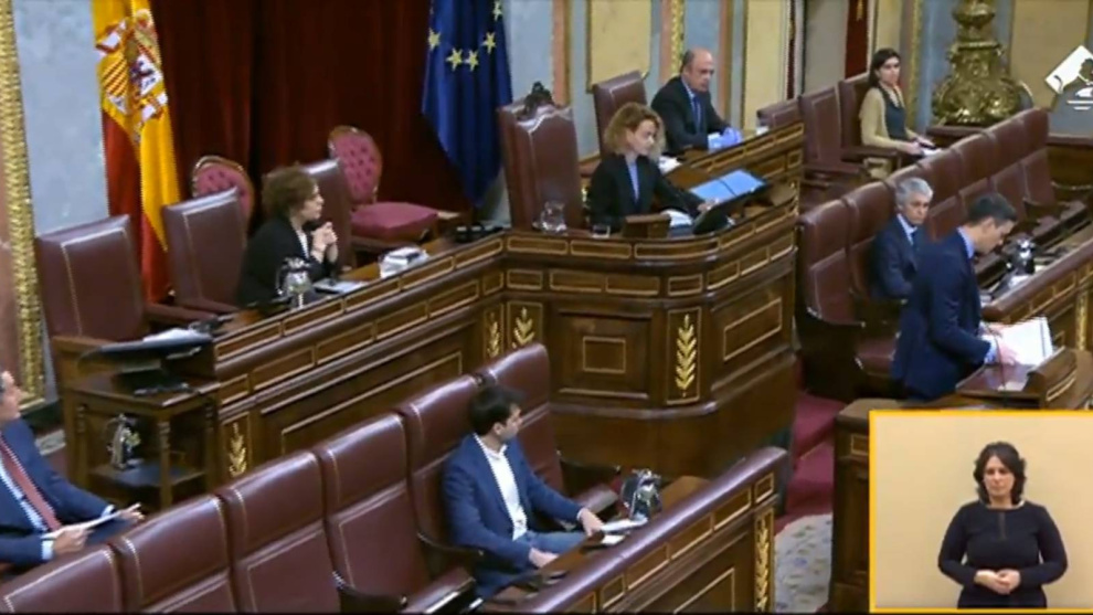 Sánchez ha comparegut a un hemicicle gairebé buit amb només sis diputats del grup socialista, cinc del PP, tres de Vox, dos del grup confederal d’Unides Podem-ECP-GEC, un de la resta de grups (per part dels republicans, hi ha acudit Gabriel Rufián), del plural (amb dos diputats) i del mixt, on finalment també hi ha acudit el diputat de Compromís, Joan Baldoví.