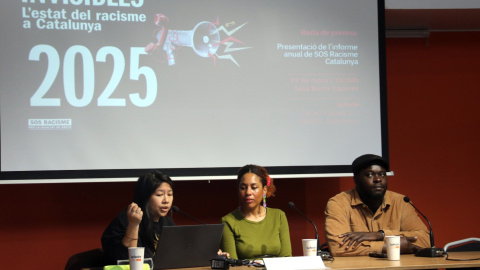 La roda de premsa de la presentació de l'informe anual de 2025 de SOS Racisme, que s'ha fet aquest dijous.
