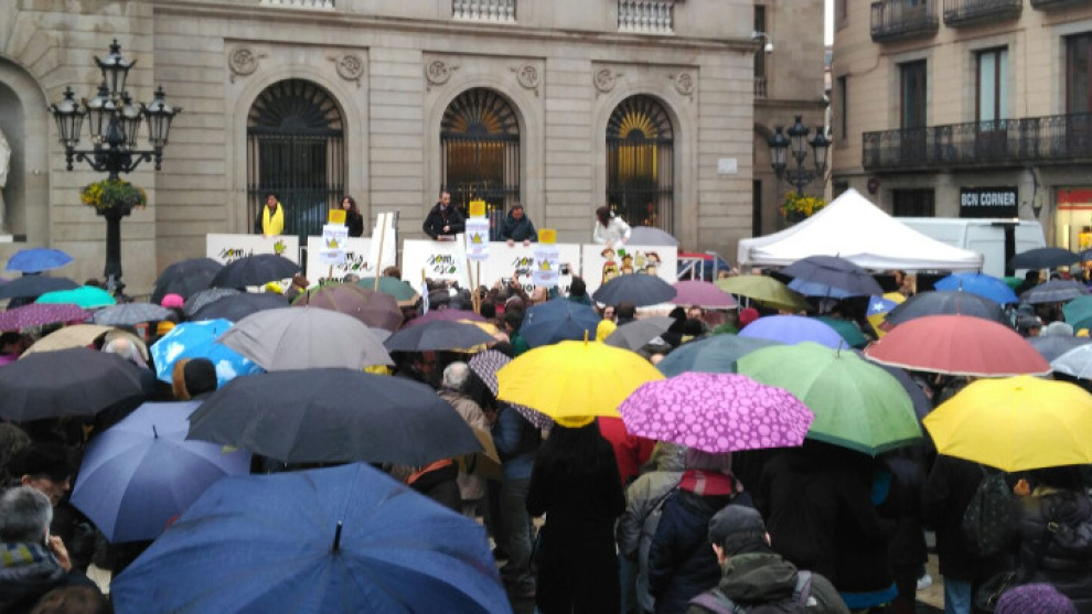 El temporal de neu pluja no ha fet enrere les entitats i els manifestants convocats per Som Escola, que avui s'han concentrat davant els ajuntaments dels municipis catalans en defensa del model d'ensenyament català. 500 persones s'han aplegat sota el paraigua a la plaça Sant Jaume de Barcelona per reivindicar la immersió lingüística, amenaçada fa dues setmanes pel Govern central per boca del ministre portaveu i d'Ensenyament, Íñigo Méndez de Vigo. A la concentració, també hi han assistit, entre d'altres, els líders sindicals de CCOO i UGT de Catalunya, Javier Pacheco i Camilo Ros, els diputats d'Esquerra Republicana de Catalunya Ernest Maragall i Najat Driouech, o la regidora de l'Ajuntament de Barcelona, Gala Pin.