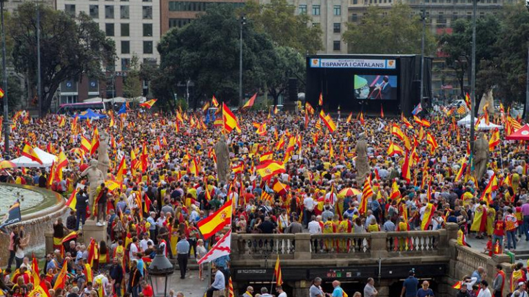 Les banderes d’Espanya han omplert el passeig de Gràcia de Barcelona de la mà d’unes 65.000 persones -segons la Guàrdia Urbana- que han volgut celebrar el dia de la Hispanitat a la capital catalana. Les acompanyaven pancartes com "separar-nos és debilitar-nos" i "STOP bloqueig de l’espanyol a les escoles", entre d’altres que reprovaven el govern de Pedro Sánchez o demanaven llargues condemnes per als presos polítics i per al president Puigdemont.