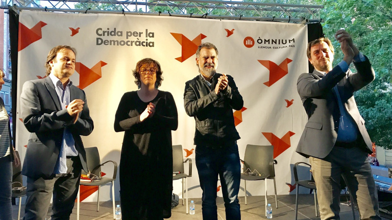 Jaume Asens, Eulàlia Reguant, Jordi Cuixart i Toni Comin en un acte de campanya a pel referèndum a Nou Barris / Europa Press