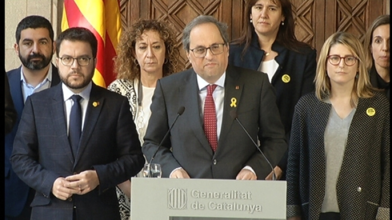 Després d'acomiadar els presos a Brians II, el president de la Generalitat, Quim Torra, ha encapçalat un consell executiu extraordinari que ha servit per mostrar el suport als encausats. Posteriorment, Torra ha llegit una declaració institucional acompanyat de tots els consellers, amb les únics excepció d'Alfred Bosch (Exteriors) i Jordi Puigneró (Polítiques Digitals), que estan de viatge oficial. En el missatge, llegit en català i en anglès, Torra ha manifestat que "som a les hores prèvies d’un judici que canviarà per sempre el nostre país i la seva relació amb el Regne d’Espanya. Es jutjaran persones honorables per haver volgut donar la veu al poble de Catalunya de manera escrupolosament democràtica i pacífica. Som, per tant, davant d’un judici també contra el dret d’autodeterminació de Catalunya i contra la democràcia".