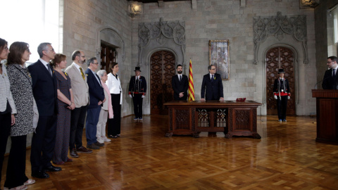 Quim Torra repeteix la fórmula que va emprar Puigdemont el 2016 per prometre el càrrec. L'acte de presa de possessió ha durat amb prou feines dos minuts, en una sala reduïda amb prop d'una dotzena de persones. No hi han acudit representants del Govern central.