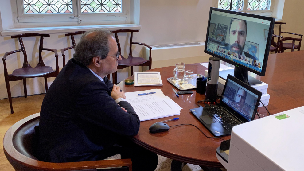 La situació excepcional que viu Catalunya arran de la pandèmia del Covid-19 ha portat a fer la primera reunió informativa sobre el coronavirus de forma virutal. Presidida pel President del Parlament, Roger Torrent, el President Generalitat, Quim Torra, el vicepresident del Govern, Pere Aragonès, el conseller d'Interior, Miquel Buch, i la consellera de Salut, Alba Vergés, contesten a les preguntes dels presidents dels grups i representants de subgrups parlamentaris telemàticament. En aquesta reunió, Quim Torra, ha explicat que, si no s'endureixen les mesures i es decreta el confinament total, el pic de la corba de contagi del coronavirus arribaria a finals d'abril i provocaria que el confinament s'allargués fins al juny. Torra ha explicat que s'han establert diversos escenaris en funció de múltiples informes científics i que el confinament fins el juny és un de possible, però que és evitable si es prenen les mesures contundents necessàries.