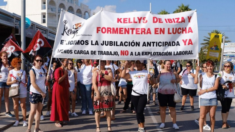 Unes 2.000 treballadores de la neteja i cambreres de pis d'Eivissa, conegudes com 'kellys', han participat aquest dissabte en la primera vaga d'aquest col·lectiu per exigir millores laborals i posar fi a la sobrecàrrega de treball, segons dades facilitades pel sindicat CGT.