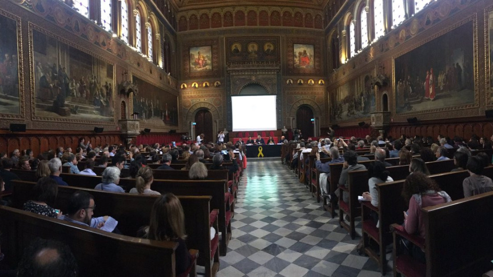 El paraninf de l'edifici històric de la Universitat de Barcelona, durant el Primer Congrés Català en Defensa de l'Estat de Dret, que s'ha celebrat aquest dissabte. | Òmnium Cultural.
