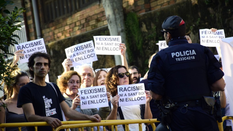 Unes 100 persones mostren cartells on es llegeix "racisme", "homofòbia", "transfòbia".... "ni a Sant Boi ni enlloc!" i criden consignes contra el feixisme. Els assistents estan determinats a evitar costi el que costi l’ascens d’opcions d’ultradreta a la vila, després que alguns dels activistes més actius del poble hagin rebut amenaces. Mantenen d'altra banda a la memòria els tres regidors que Plataforma per Catalunya va aconseguir el 2011.