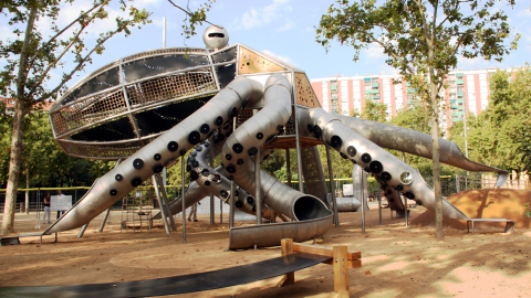 Comencem per un clàssic: el Parc de la Pegaso, al barri de la Sagrera. Hi ha un pop metàl·lic amb tentacles que són tobogans i un cap amb cordes i passarel·les per on els nens poden grimpar i lliscar. També hi ha més elements segons les edats dels nens, com una zona tova, un petit llit elàstic, gronxadors niu i passarel·les, tot amb reminiscències del món marí.